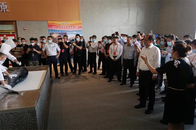 “咣!上魚嘍!”伴隨一聲嘹亮的吆喝,六人抬著一條200斤重的的金槍魚,送到展示廳廚師面前現(xiàn)場開魚,作為隆重又極具特色的海洋民俗文化,碩大的金槍魚在主刀廚師手里,僅僅幾分鐘就被去頭去尾,剔骨剝?nèi)?現(xiàn)場觀眾不禁叫絕。9月23日下午,2021山東省旅游發(fā)展大會(huì)參會(huì)代表一行來到芝罘灣商旅綜合體觀摩考察,打卡煙臺(tái)生態(tài)漁市文化新地標(biāo),體驗(yàn)商旅融合多元休閑新場景。