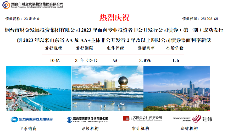 6月6日,煙臺財金集團2023年面向?qū)I(yè)投資者非公開發(fā)行公司債券(第一期)成功發(fā)行。本期債券發(fā)行規(guī)模10億元,期限3年(2+1),票面利率3.97%,全場認(rèn)購倍數(shù)1.5倍,集團作為AA主體,創(chuàng)2023年以來山東省所有AA、AA+主體非公開發(fā)行2年及以上期限公司債券票面利率新低,且票面利率低于山東省2023年以來同級別、同期限非公開公司債253BP以上。本期債券發(fā)行由申萬宏源證券有限公司主承,聯(lián)合資信、天圓全會計師事務(wù)所及建緯律師事務(wù)所分別提供信用評級、審計和法律服務(wù)。